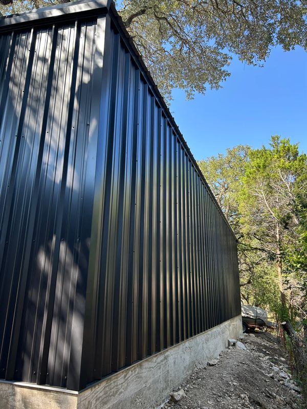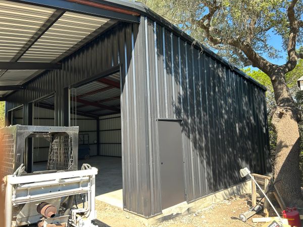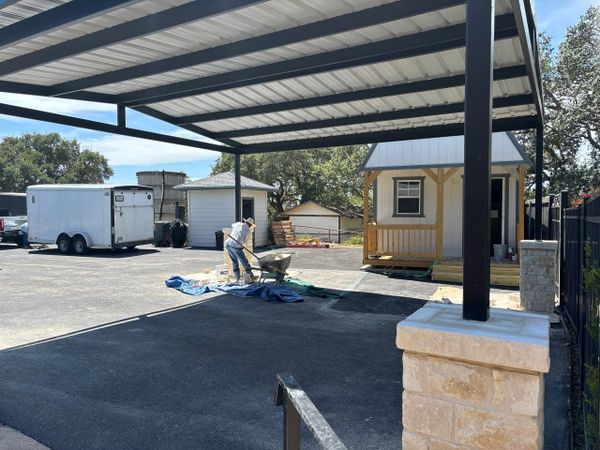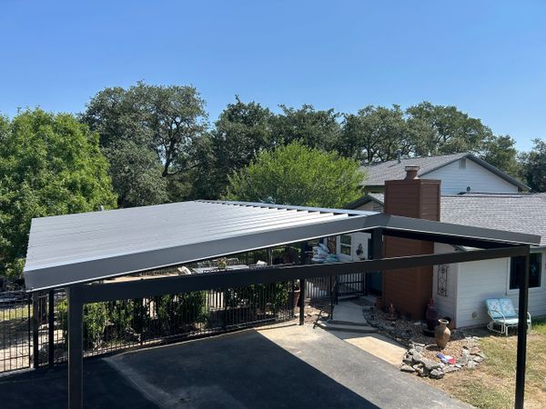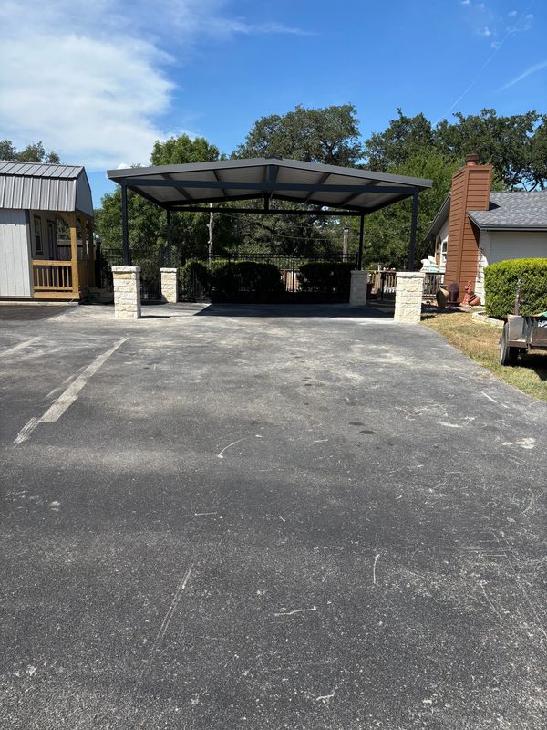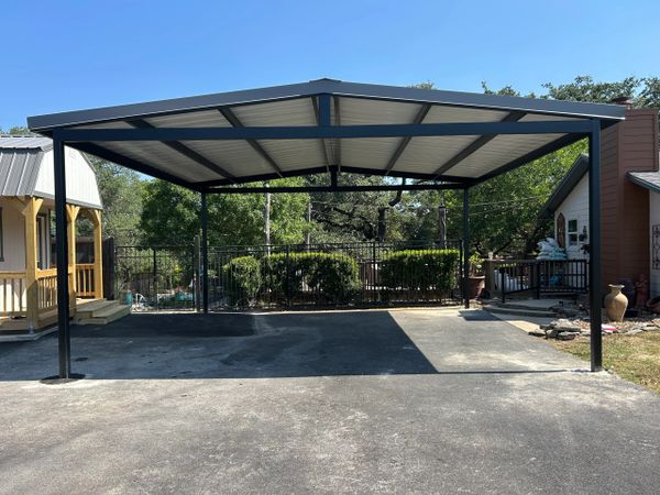 24x22x12 tall carport we designed and fabricated. Grey roof sheets,gutters,downspouts and trim to match the existing shed next to it. 4 ft tall rock columns to match the house on the other side and we painted all the steel black. Enough room for 4 vehicle‘s to park underneath it.