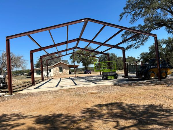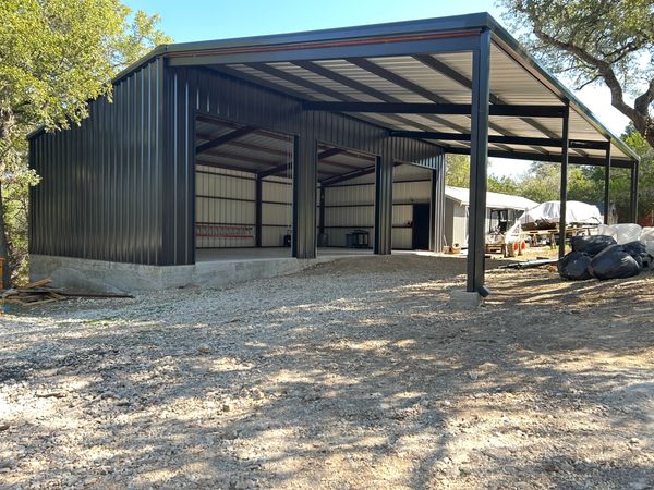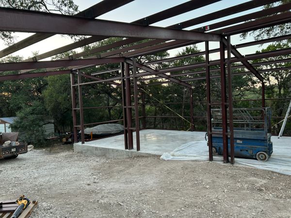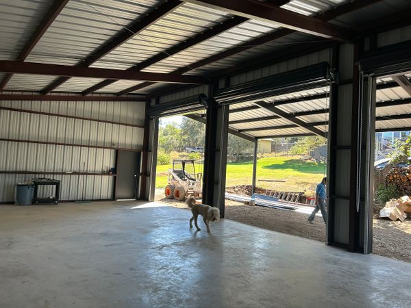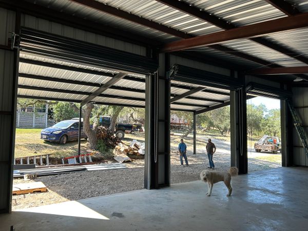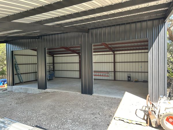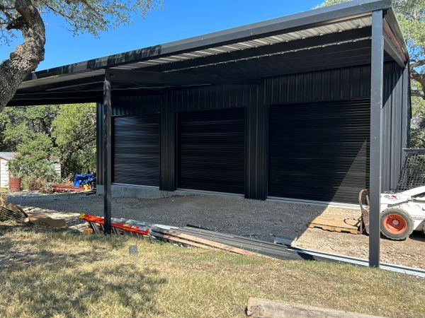 48x48 weld up workshop with 3 12x12 roll up doors all blacked out in spring branch. We added some extra beams in the first bay of the 24x48 slab to support a 4 post car lift. With a 16ft peak and 12ft eves this customer will have plenty of room to work.