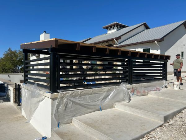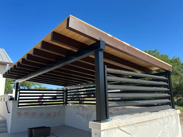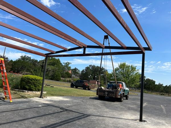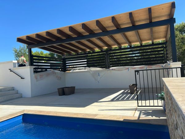 This is a pool cabana that we pre-fabricated and painted at our shop and then put together on site. Lots of heavy duty steel supporting a beautiful wood roof.